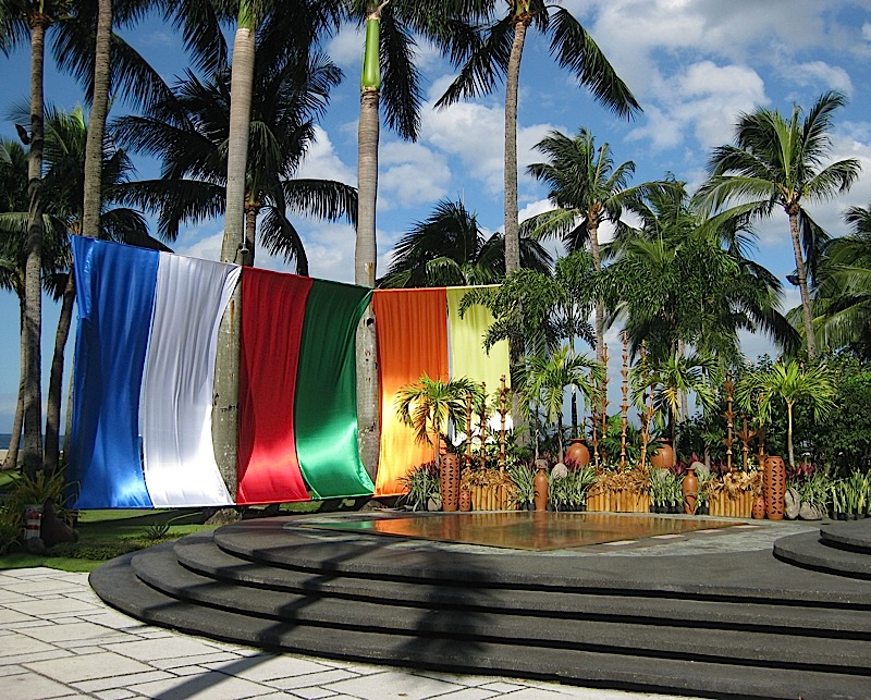 THEME DAY: BRIGHT COLORS • The outdoor Sunset Bar of Sofitel Manila has a small platform for performances and cultural presentations. The row of satin banners which serves as its backdrop is reminiscent of the colorful sail of the traditional Mindanao Muslim boat called the vinta. Quite appropriate since the hotel is right beside Manila Bay.
